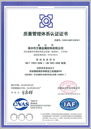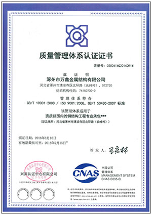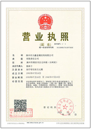 涿州市萬鑫金屬結構有限公司,自2002年成立以來,一直秉承“實現企業最大價值的同時實現員工和客戶的最大價值 ”的經營理念,堅持“一切按制度管理、一切按程序操作、一切用數據說話、一次把任務完成好”的企業作風,堅持以“安全第一、質量第一、服務第一”的企業宗旨,為客戶提供設計、制造、安裝一條龍的工程服務。