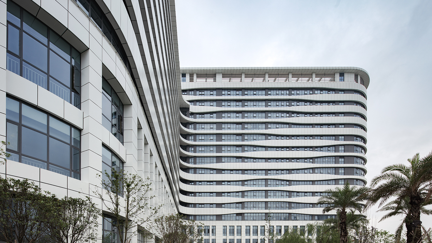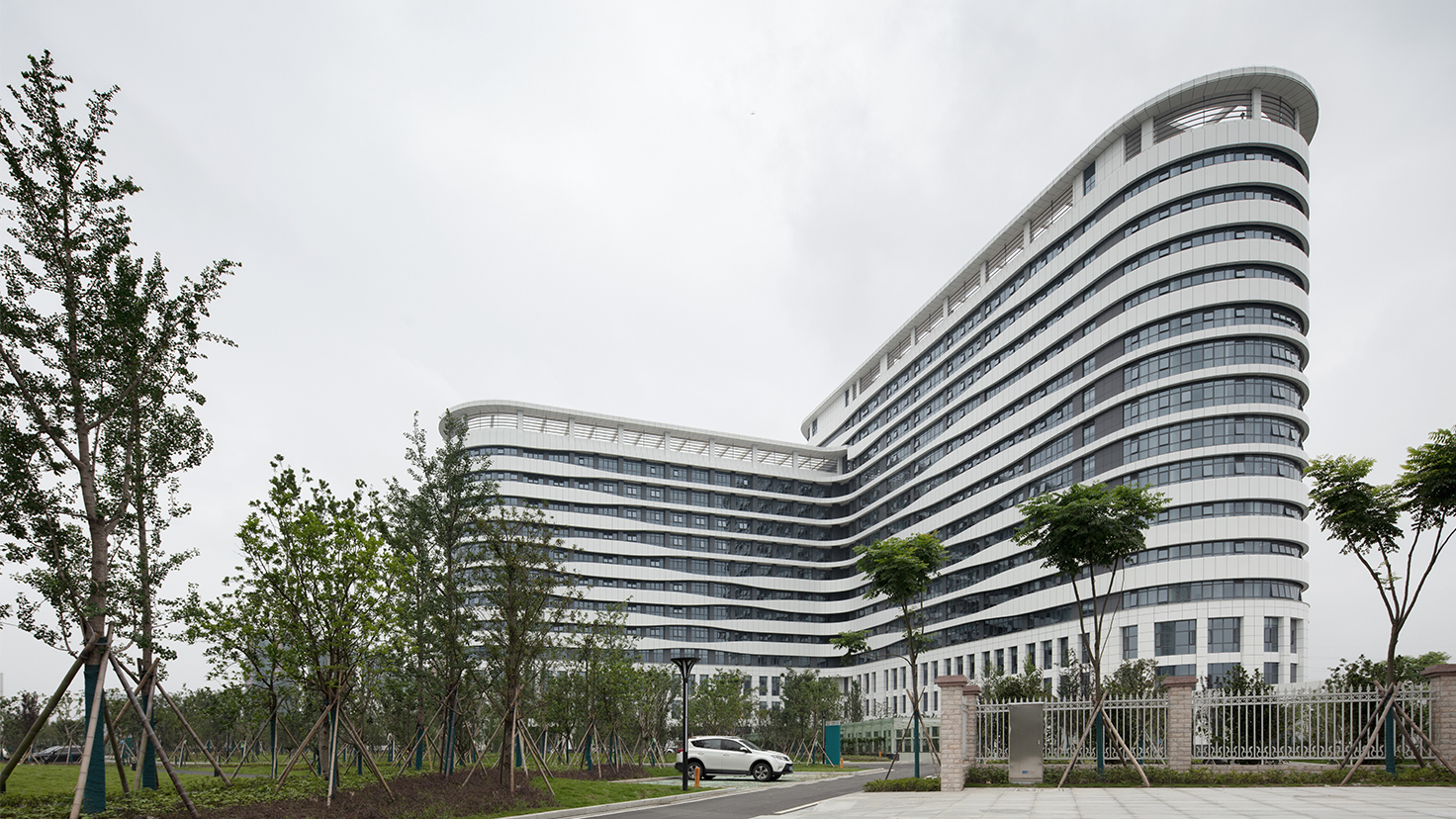 设计背景:花园中的医院,将医院至于花园之中,是我们对这个新建的医院整体环境的期待。我们将医院的主体建筑放置在地块相对中间的位置,绿化、广场围绕着主体建筑,希望我们的病人到达医院门口,走进门诊大厅或者住院大厅的过程中,感受优美的、安静的环境,心情愉悦起来。特别是住院病楼,远离地块的边界,希望他们在病房中有开敞的视线,安静的环境,不受制于南边地块的以后的建设的干扰。 根据医院的使用要求,我们住院部分是由一栋15层的两个护理单元的普通住院大楼和一栋12层的康复楼组成。我们都希望这两栋大楼直接与医疗主街相连,便捷地共享医技。经过多方案比较,我们发现“Y”字形布局,将这两栋楼合成一个整体非常契合我们定下的“花园中的医院”的想法。