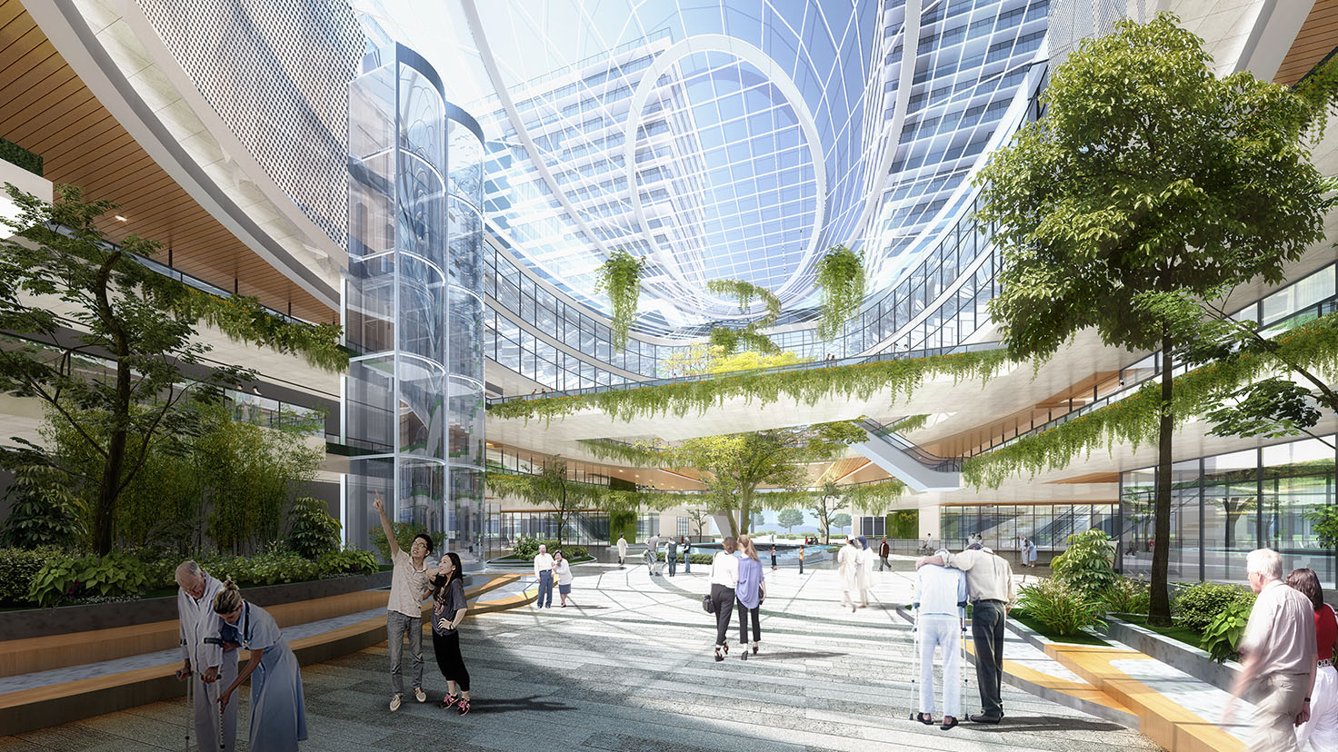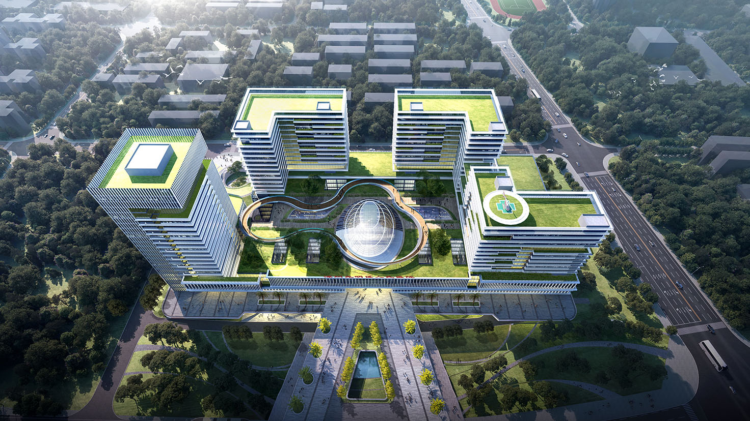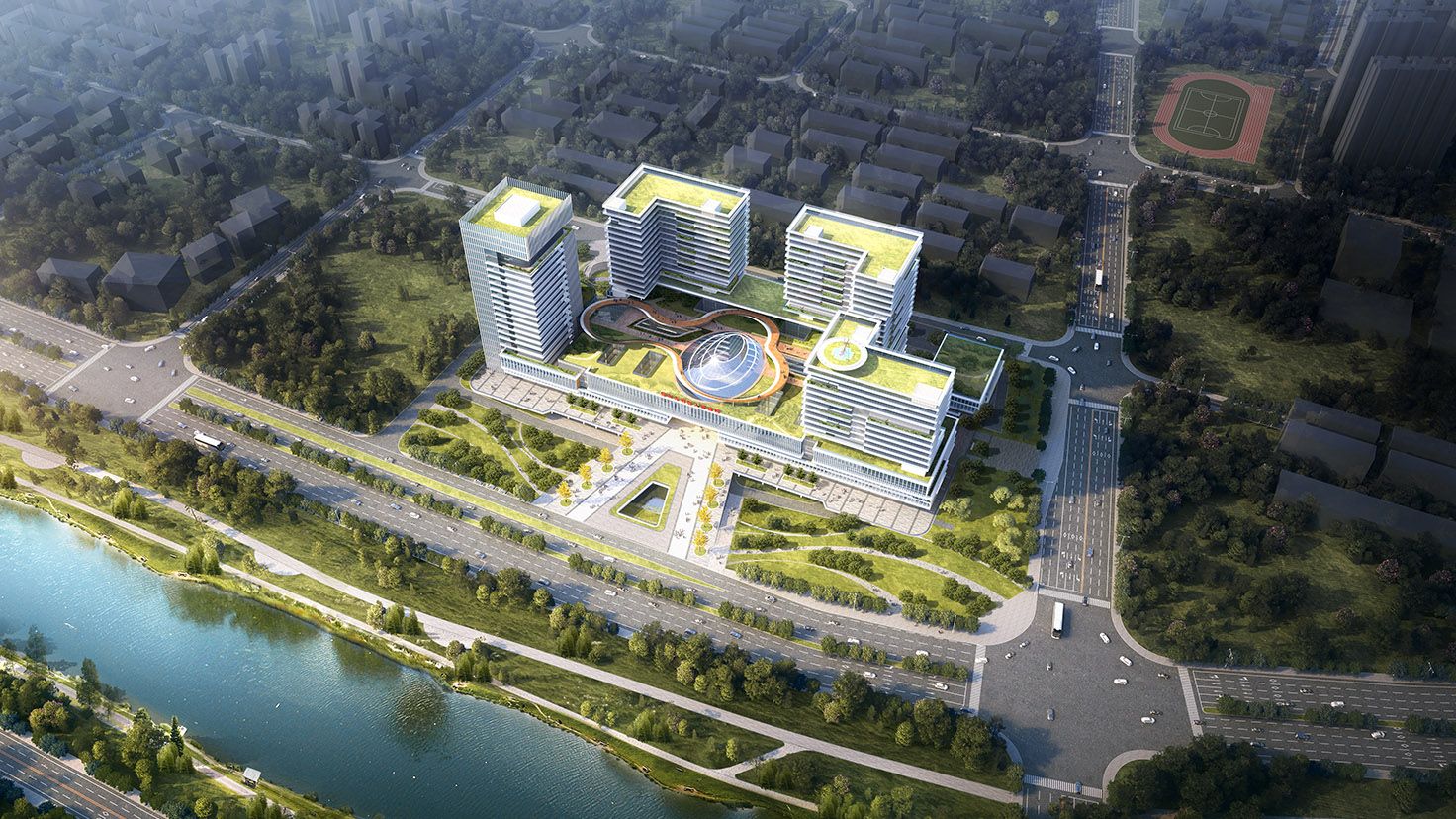 设计背景:以十字型街为骨架、跳动的绿心为主题,在高度集约化的建筑布局下利用富有节奏感的线条及体块的变化,创造呼吸感,通过屋顶康复花园、空中花园的设计缓解用地紧张带来的绿地缺失。