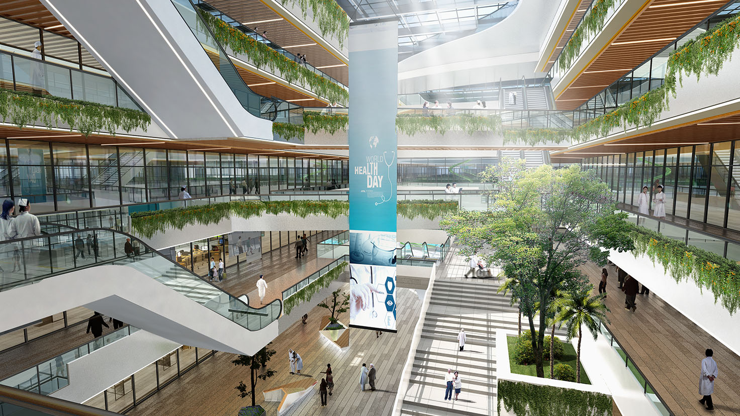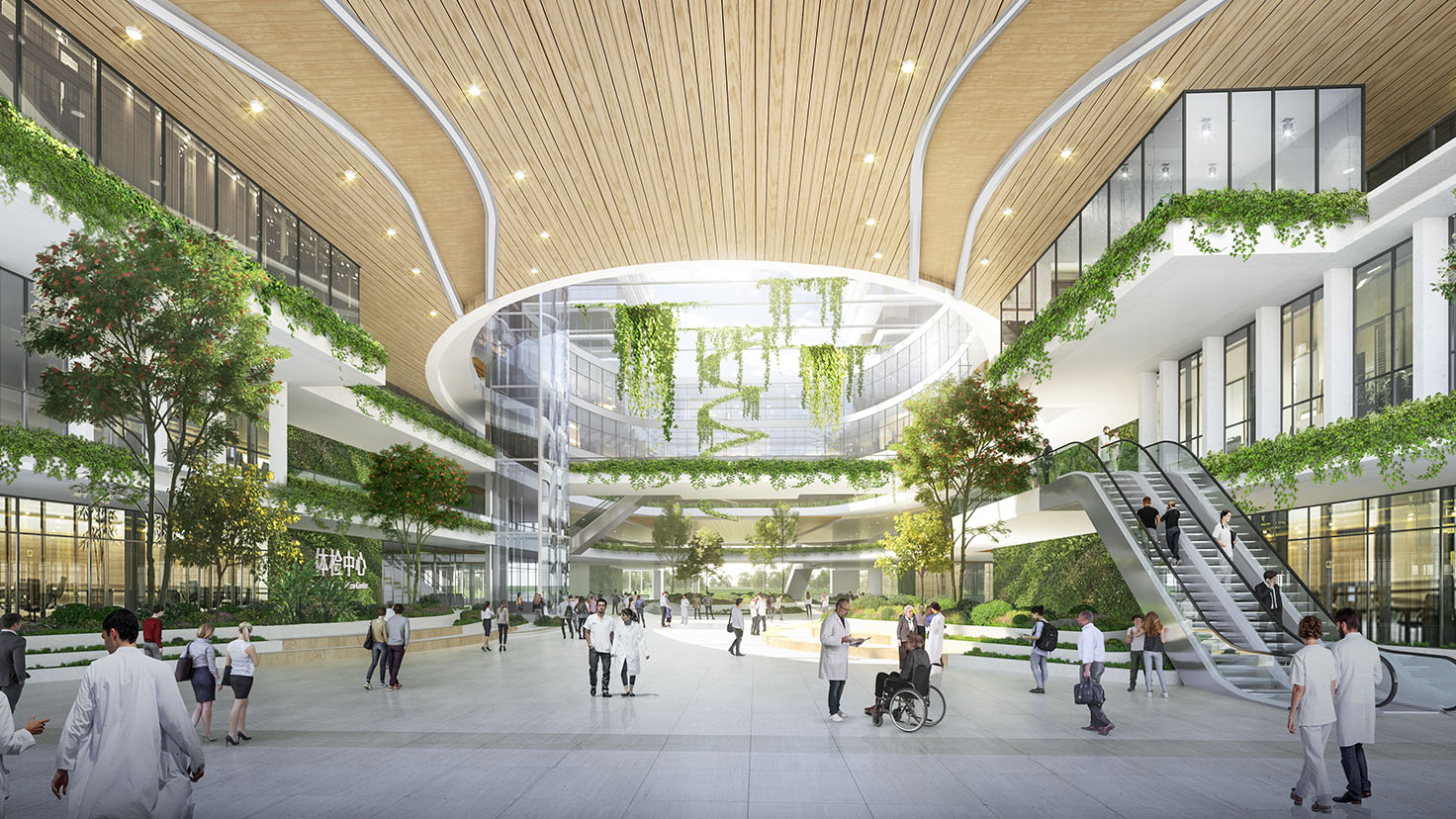 工程简介:建筑与周边环境紧密融合在一起,和谐共生,营造出开放、轻松的城市界面空间与形象。在复杂的交通体系中打造人行和车流的双枢纽平台,在医疗功能高效的前提下设置多护理单元,多中心化,实现平疫结合,塑造平和宁静的医院建筑环境,为患者和医护人员提供多元生态的休憩场所。