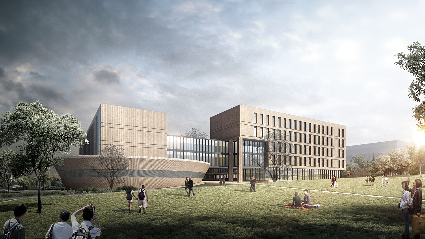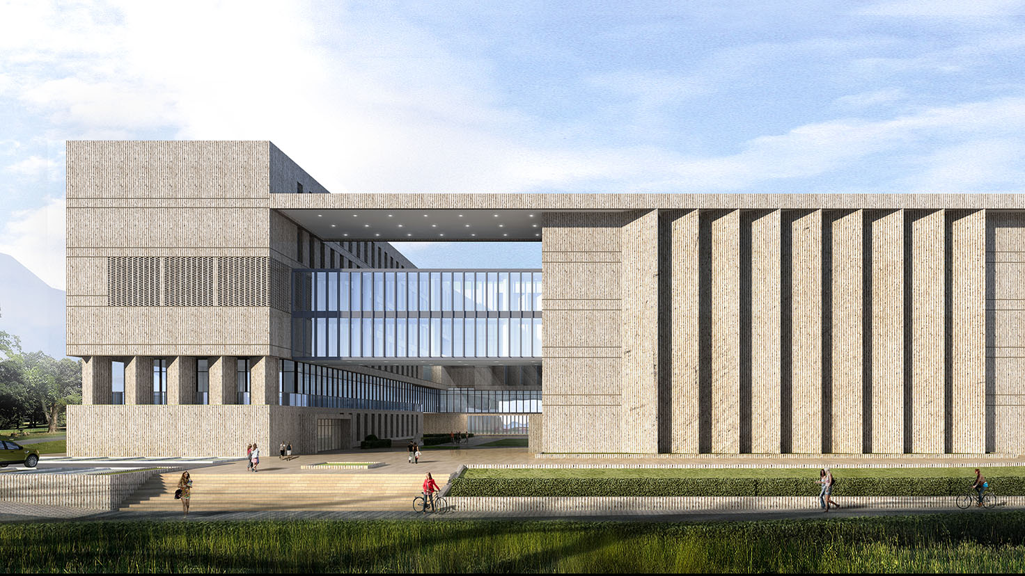设计背景:本案遵循基地现有特性,合理利用原有地形高差进行设计,将南、北两栋在高度上形成“北高南低”之势以呼应地形的特性。充分利用台阶、坡道、连廊等灰空间将建筑空间融于自然环境中,使其建筑与自然环境共融,形成“山水校园”。 通过虚实穿插的庭院空间营造不同的空间关系,整体形成一种“既围合又开放”的空间布局。这种空间布局既体现了学校各院系对内研究的严谨性,同时又利用开放空间满足各院系之间交流与学习的需要。这种“既围合又开放”的空间布局同时映衬着毛泽东同志虚怀若谷、海纳百川的气魄,体现的是一种各院系之间的团结精神。"