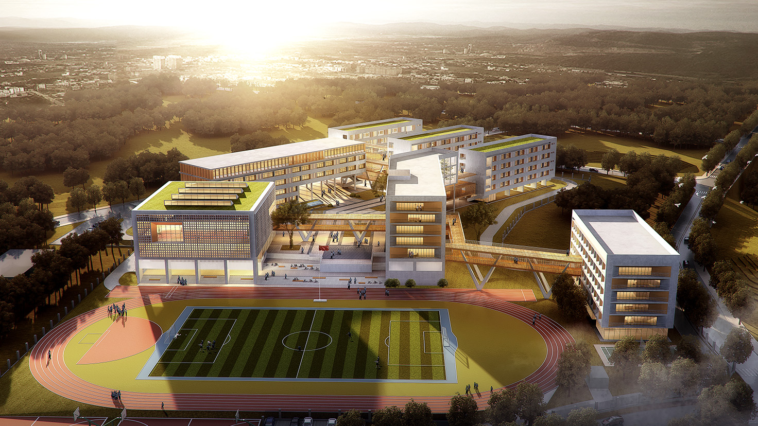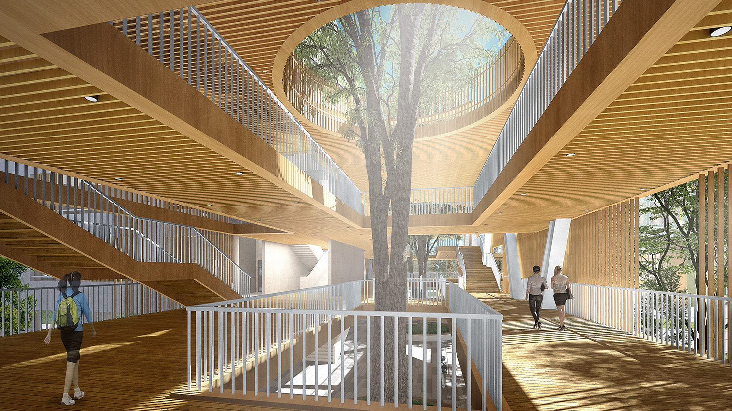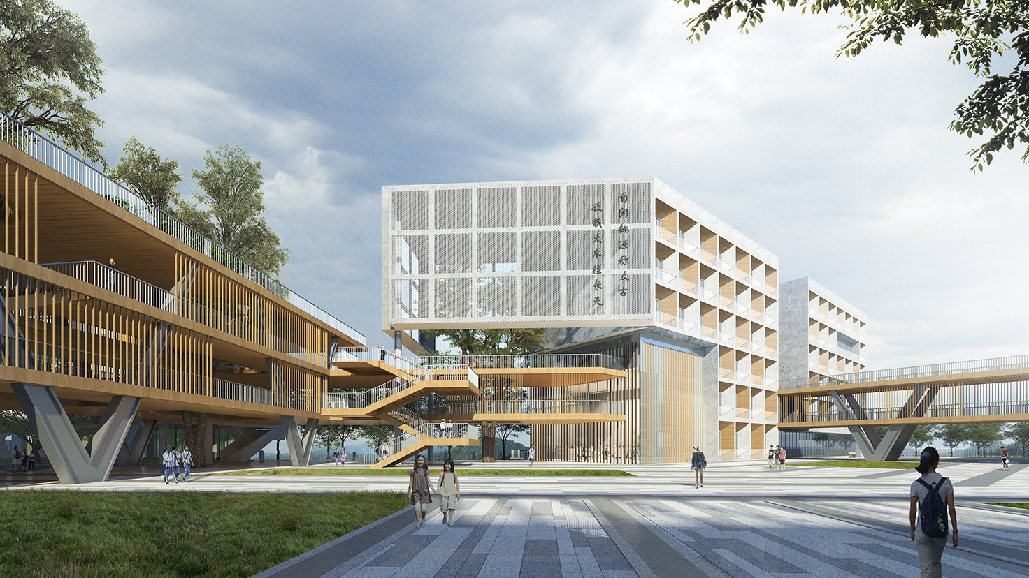 设计背景:杨昌济,后世称“板仓先生”,一生致力于教书育人,培养出毛泽东、蔡和森等一批国家栋梁之材。其作联“自闭桃源称太古,欲栽大木柱长天”正是其一生理想。 本次设计由板仓先生的理想出发,“欲栽大木柱长天”,“木”是中国教育的开始,至圣先师孔子便是在树下为门下弟子传道授业。让树木在建筑中生长,打造板仓先生理想中的教书育人的“桃源”。 由于学校各建筑功能的丰富性以及独特性,我们将建筑进行人为的动静分区以保证其良好的教学秩序,但是各功能区通过连廊相连接,围合成多变的组团空间,不同尺度的内庭院相串联,营造出安静、舒适的教学与活动环境。