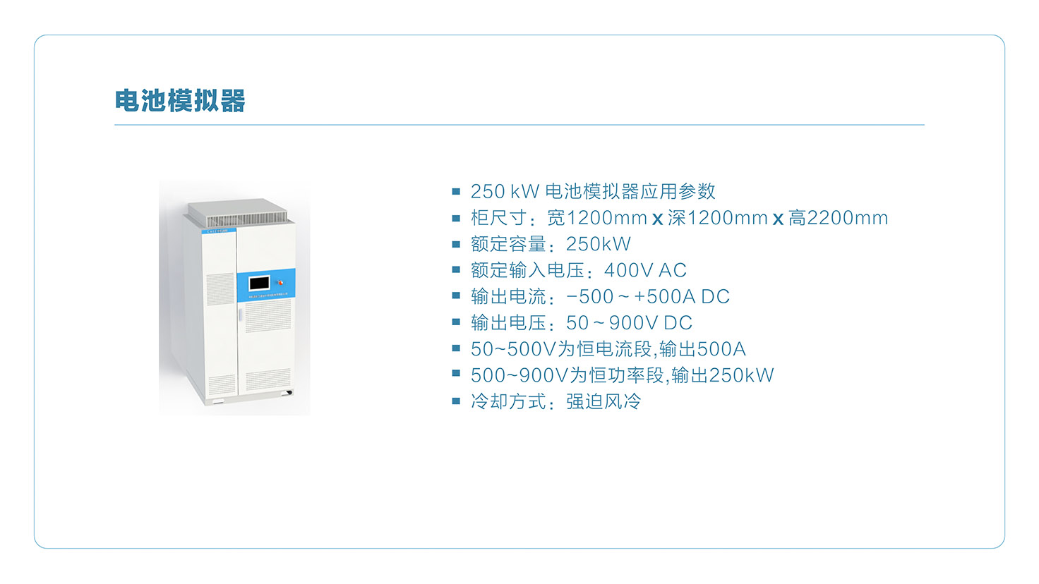 模拟器采用四象限PWM整流技术、双向DCDC技术和纯数字控制技术,具备输出稳定精度高、瞬态响应迅速、能量双向流动等特点,可模拟动力电池充放电等动态特性。同时具有RS485、以太网等远程通讯接口,可以与上位机连接形成智能系统,实现对电池模拟器运行状态的实时??杀嗉瓒ú煌绯乩嘈汀⒋⒘?,不同SOC等变量条件电池特性,可以自定义电池变化特性。